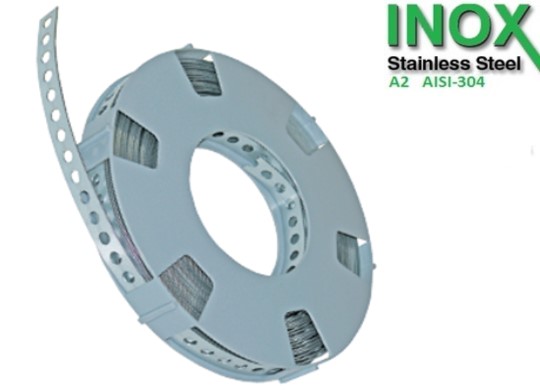 Roestvrijstaal AISI 304 gaatjesband, bandijzer of montageband op rollen met perforatie, is geschikt voor het ophangen en bevestigen van bvb. leidingen aan de muur, of betonnen vloer, betonnen gewelven, houten balken enz. WAAR CORROSIE-BESTENDIGHEID een vereiste is. Makkelijke en veelzijdige bevestiging die op gewenste lengte kan aftgekort worden. Te bevestigen met nagels, schroeven en fixpinnen. De verpakking in een kunststof afrol-cassette maakt de handelingen met dit product eenvoudig en probleemloos.